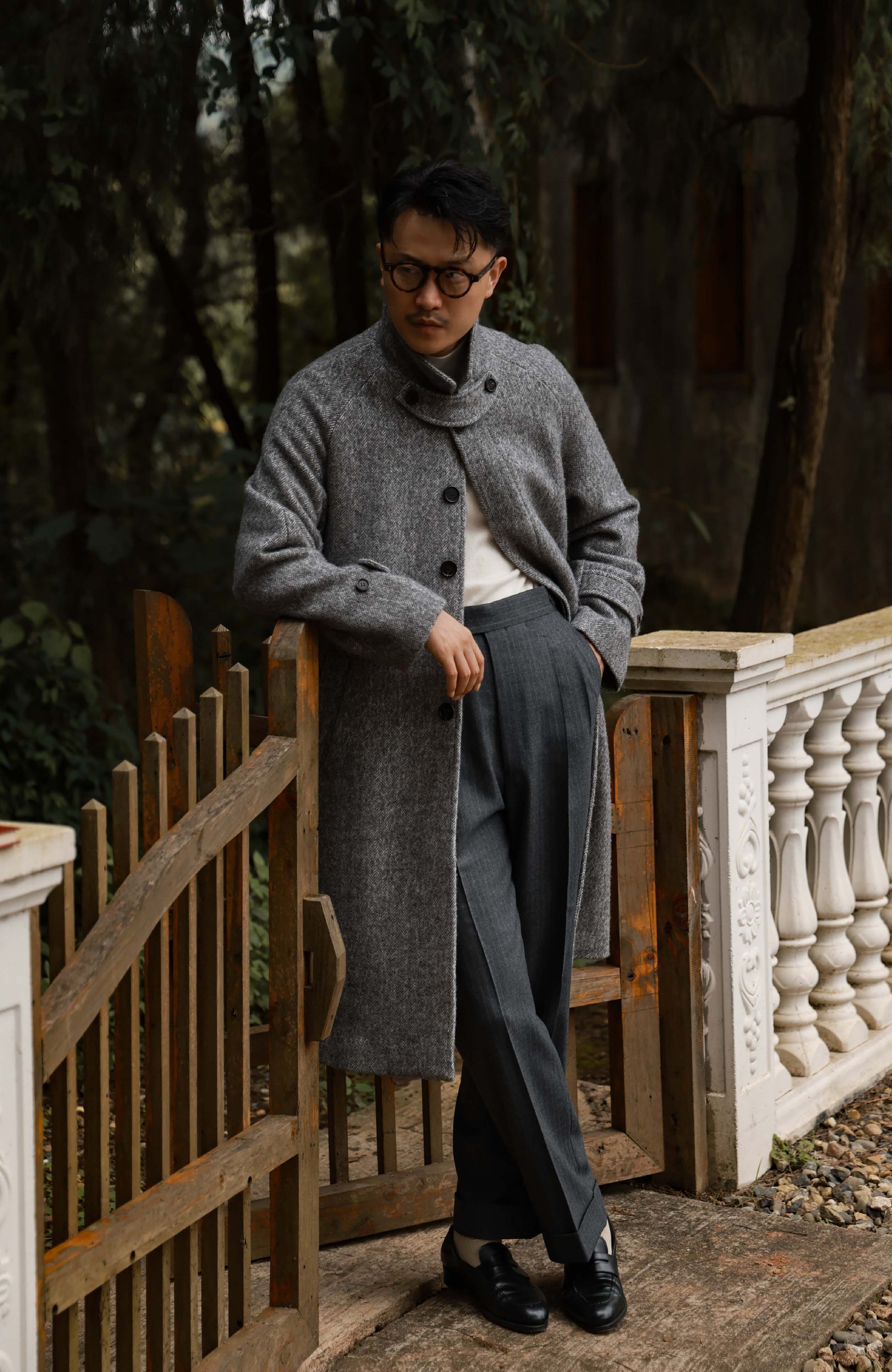High-Waisted Flannel Suit Trousers with Parisian Side Adjusters — Lunar Gary Pin Stripe